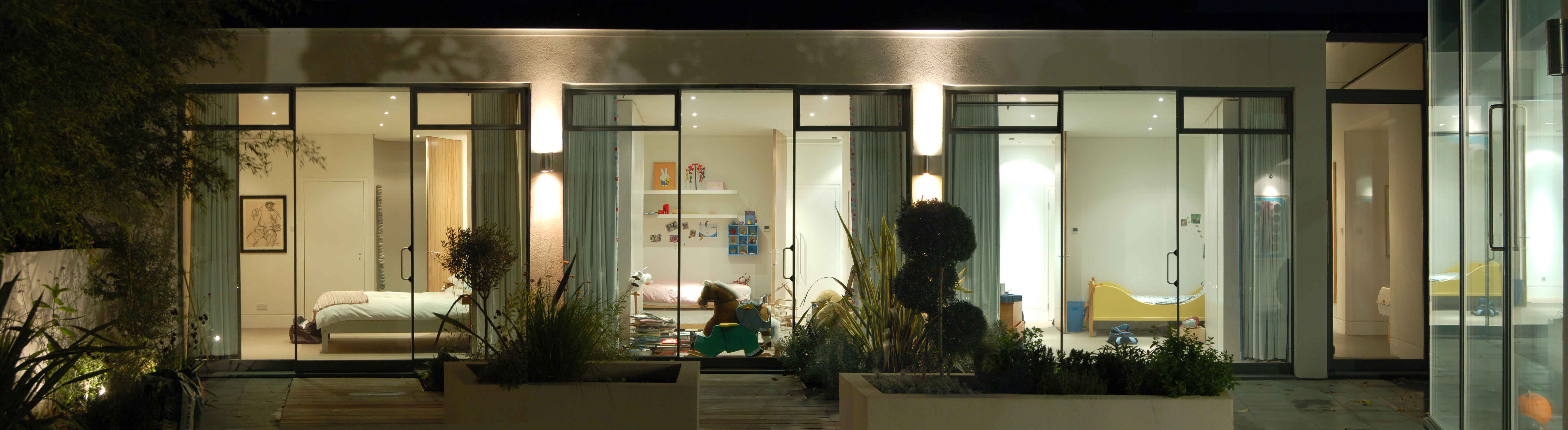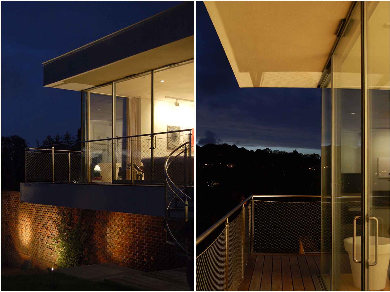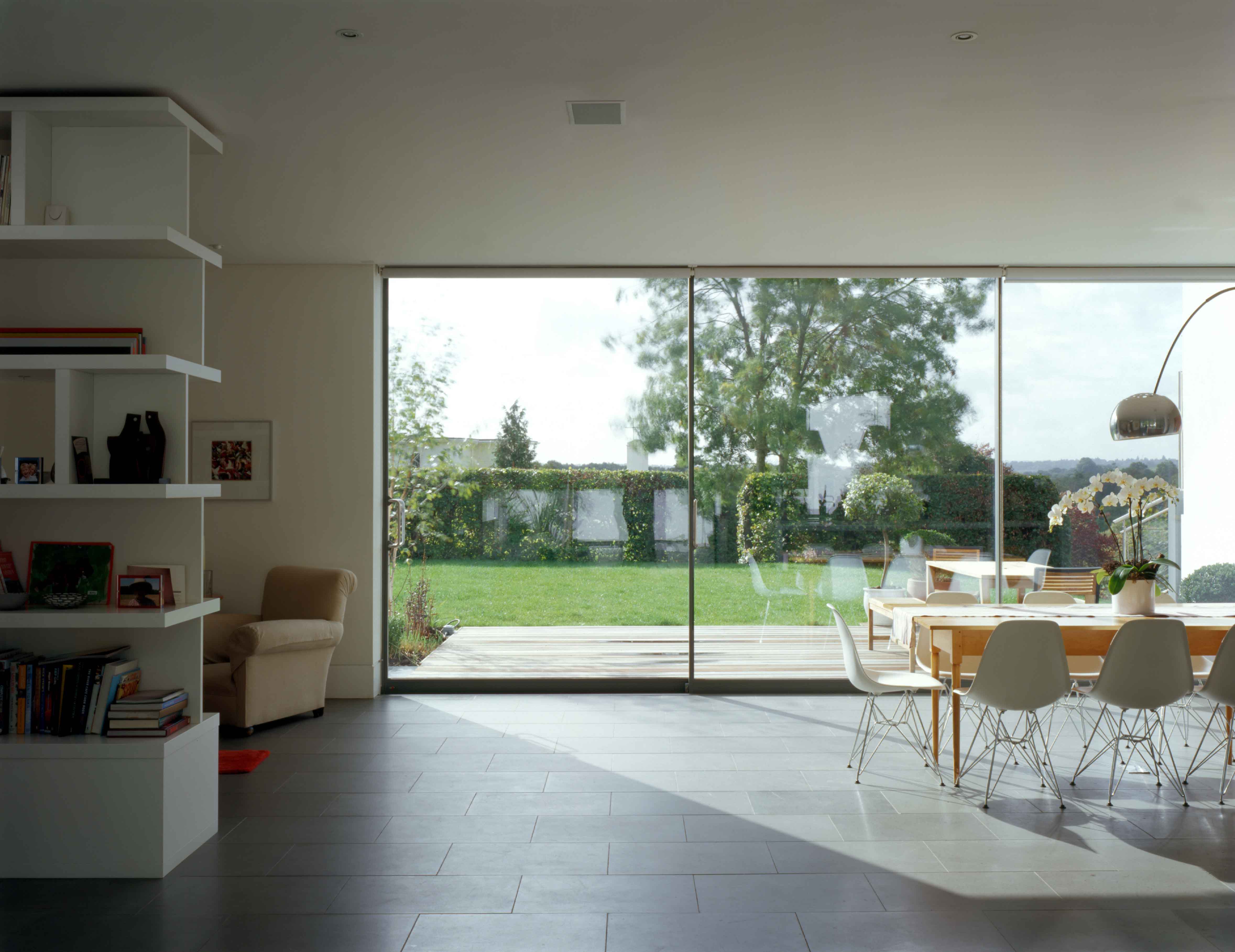 All ceilings, doors, and glass openings are 2.8 metres high and virtually frameless. The floor level outside is the same as inside – all thresholds are without a step. There are no traditional architraves, skirtings, covings, or copings. Super-insulated self-repairing roof, structural glazing, zoned under-floor heating, central vacuum, a hard-wired digital data and audio-visual network and central & distributed lighting & ventilation (rooflight) controls are some of its hi-tech features that enable the demanding, flexible-living brief of the clients.
