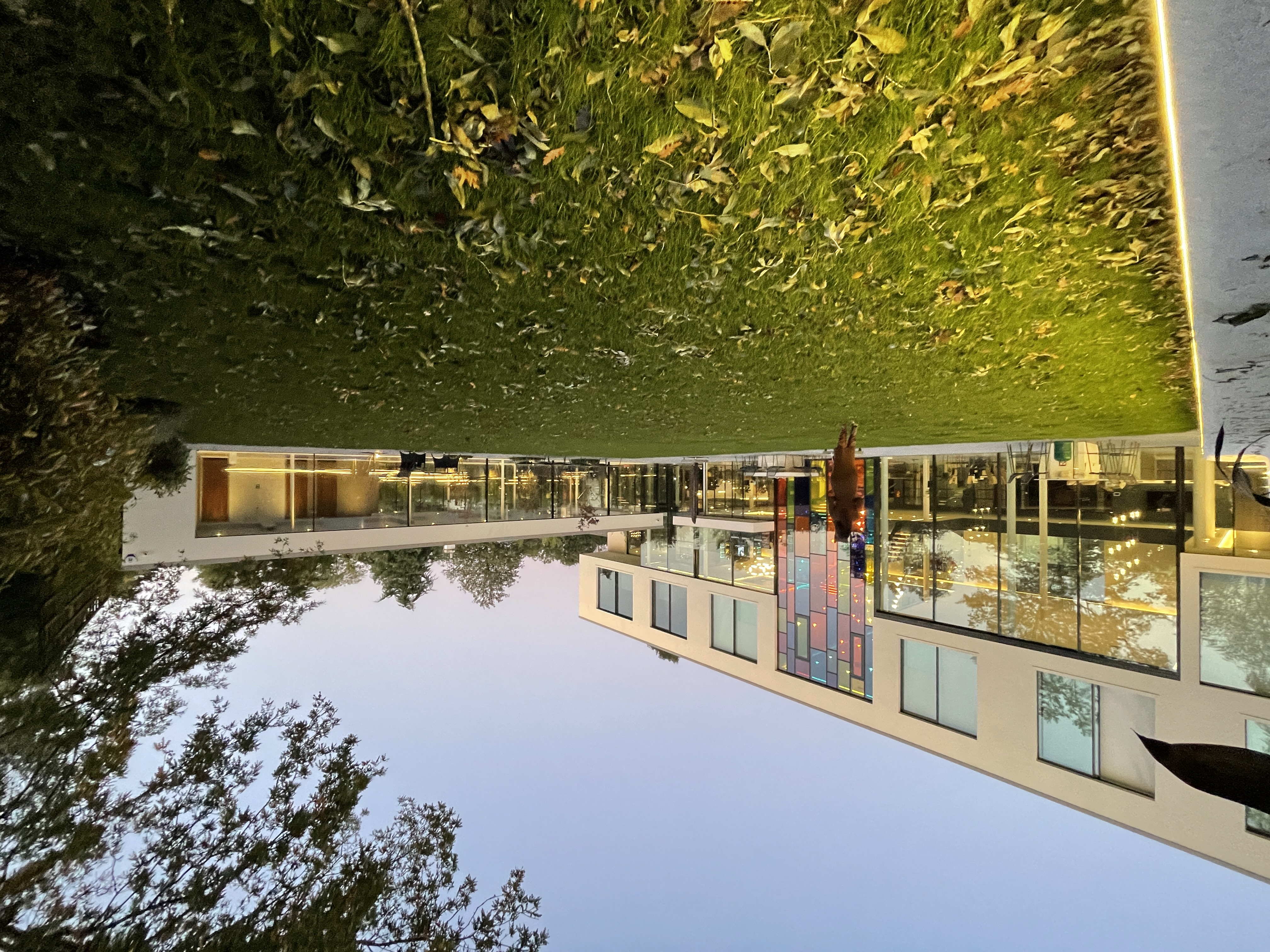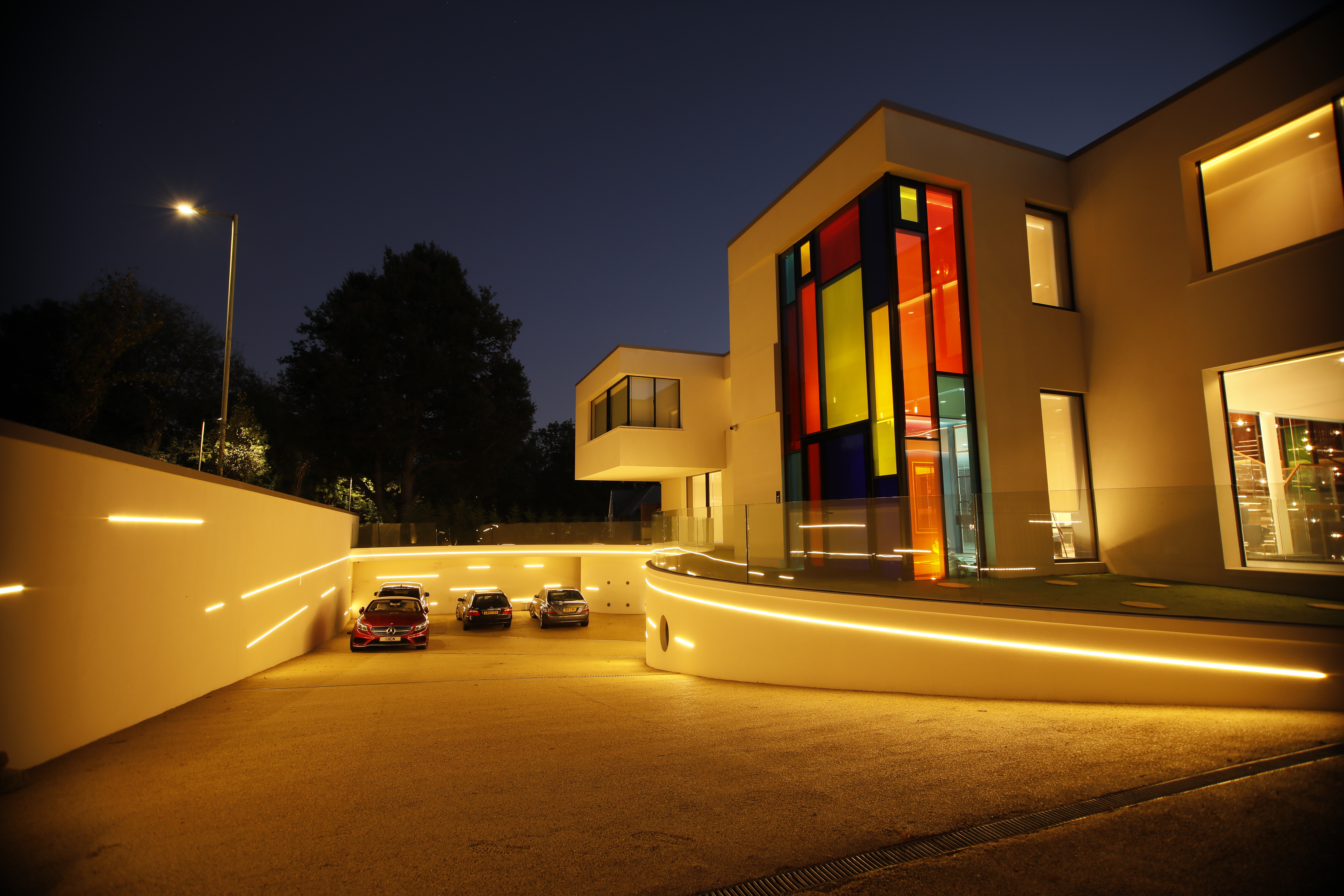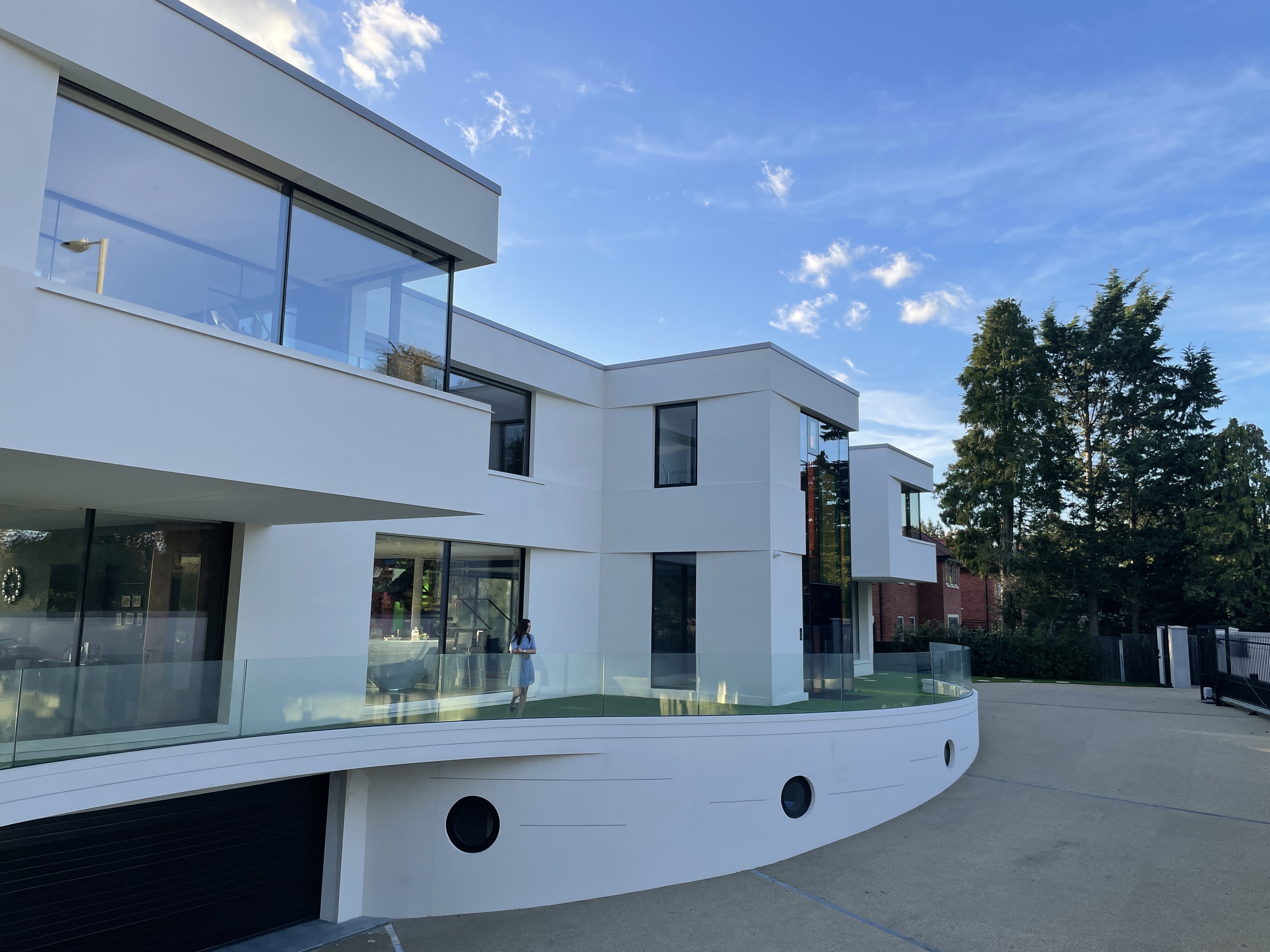 The front driveway and landscape shape is derived from the ancient Hindu symbol 'Aum'.The driveway is wide enough to