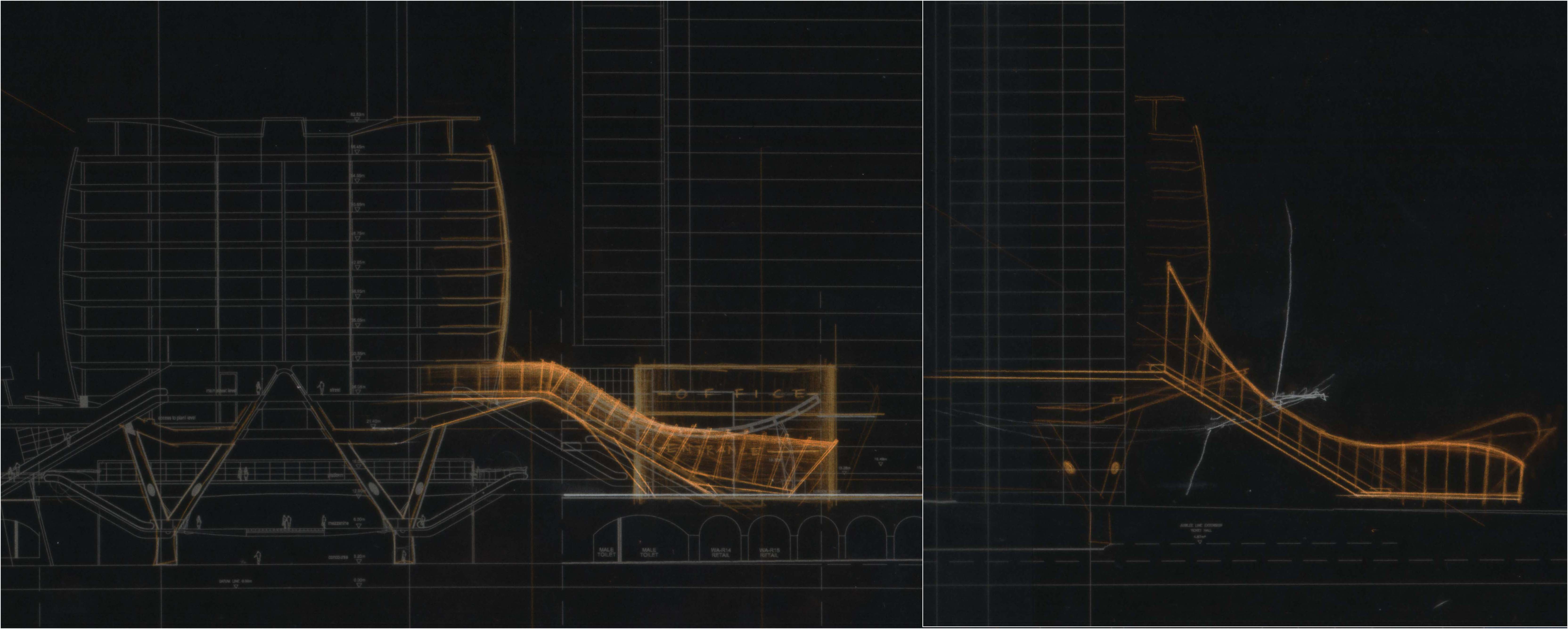 Suraj produced three concourse access options along with an air-rights building designed to take advantage of this triangular void where no platform was necessary. The model on the right is a model of the last sketch on the left. It shows how mass pedestrian movement could take place on this wide 1:15 ramp fitted within this triangular void, eliminating the need for any escalators. It would be one continuous street rising up gently to the new station concourse with retail stores flanking it all the way, and with clear daylight above.