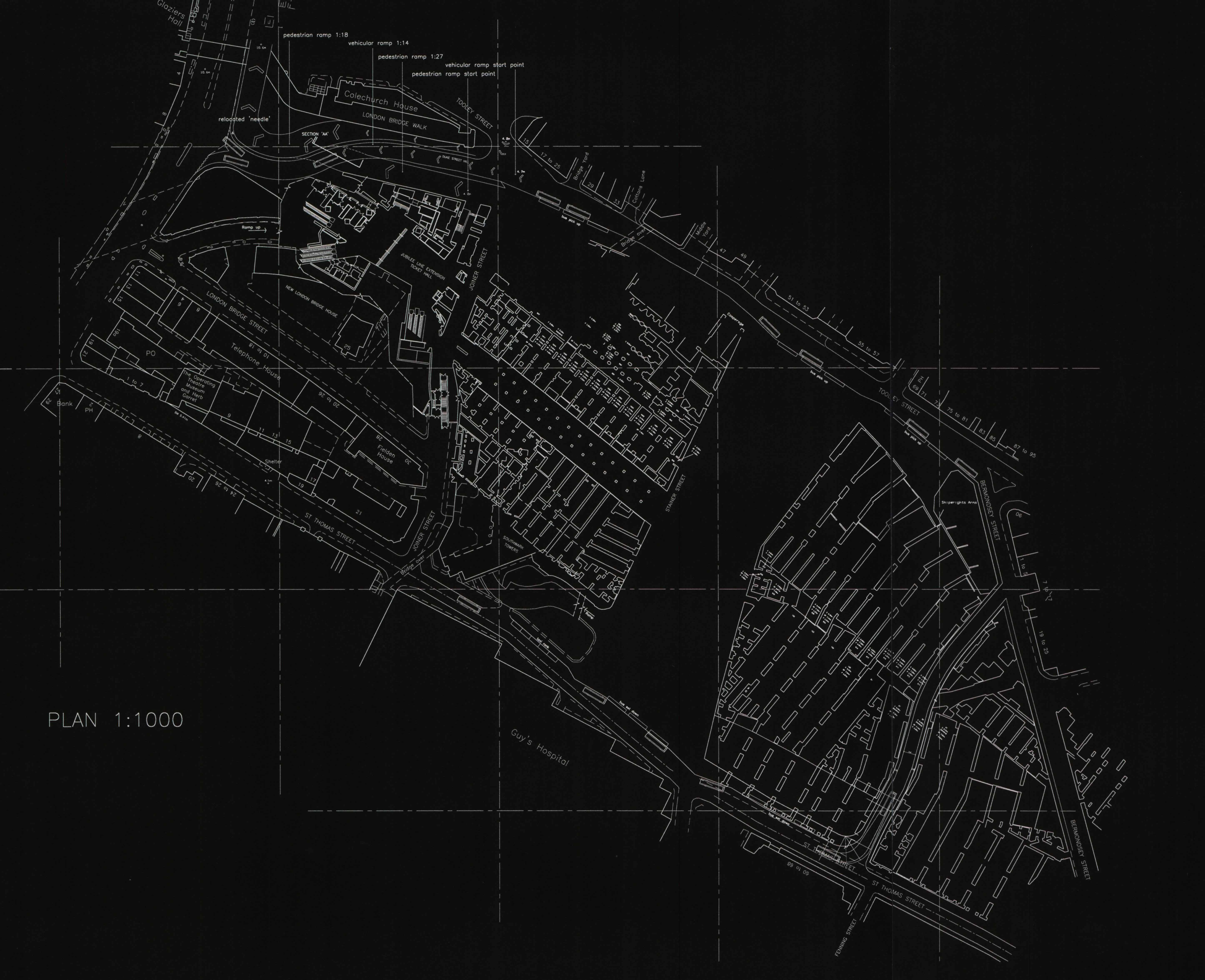 Proposed London Bridge street level plan showing extent of brick-arched abutments to be cleared to create the new north-south linking street and the main entry hub to the new London Bridge Station; the plan below also shows the new pedestrian access ramps and vehicular traffic management on tooley street.